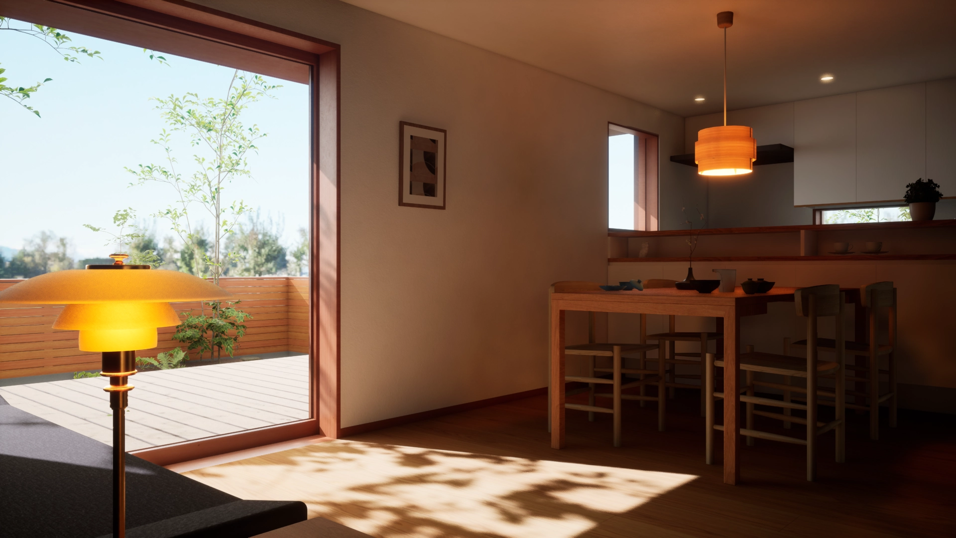 玄関から奥へ進むほどに、家族との距離感や過ごし方が自然と変化する、巻貝のような構成の住まい。キッチン・ダイニングからリビング、ワークスペース、そして屋内テラスへと、シーンごとに心地よい居場所が広がります。家の中心には回遊性のある収納を配置し、ライフスタイルに応じて自由に使えるのも魅力。2階にも畳スペースを設け、暮らしの楽しみが随所に詰まったプランです。
